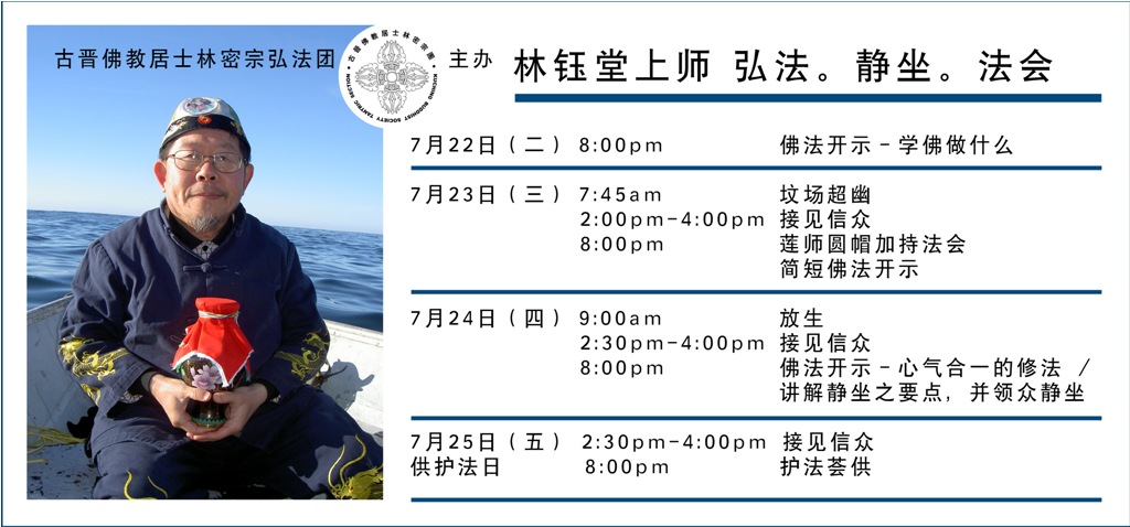 林上师已经多次来过古晋,此次古晋佛教居士林藉林上师今年亚洲弘法行旅,再次得到他慈悲的首肯,前来古晋弘法,地点在居士林二楼禅修室。林上师在古晋将举行系列法务活动,欢迎大众踊跃出席。